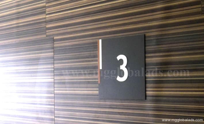 Indoor acrylic room number signage featuring a black square with white “3” on a striped wall, sign maker Philippines by M&G Global Ads.