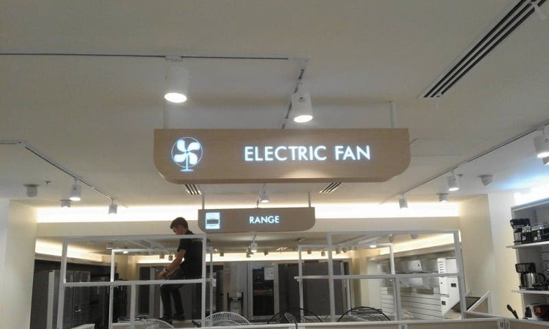 Indoor acrylic store signage reading ELECTRIC FAN and RANGE in Metro Manila by sign maker Philippines, M&G Global Ads.