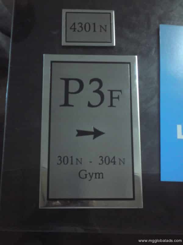 Indoor stainless steel wayfinding sign, P3F arrow 301N-304N Gym, black text. Metro Manila. Sign maker Philippines by M&G Global Ads.