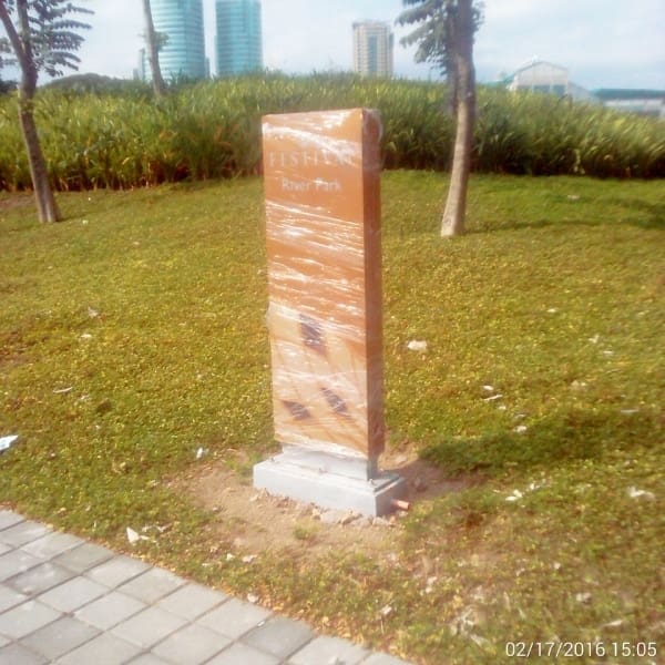 Outdoor wayfinding signage, brown aluminum Festival River Park sign in Metro Manila, by sign maker Philippines M&G Global Ads.