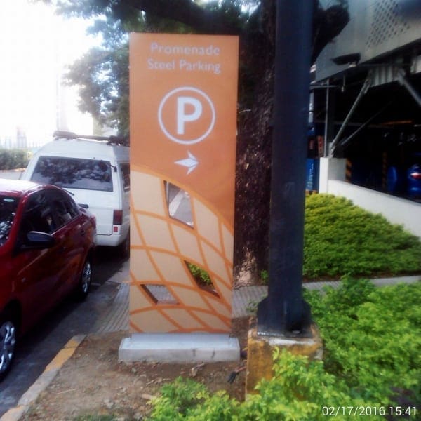 Outdoor parking sign, Promenade Steel Parking, Metro Manila, pylon type. Sign maker Philippines by M&G Global Ads.