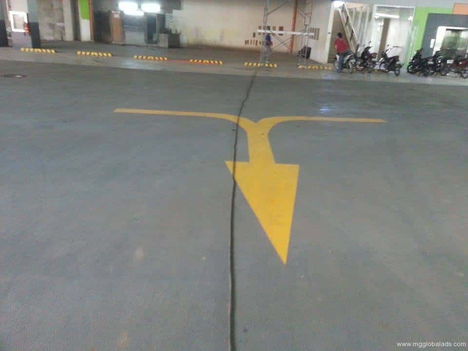 Parking wayfinding painted floor signage with yellow arrow for traffic direction, motorcycles in background, Metro Manila. Sign maker Philippines by M&G Global Ads.