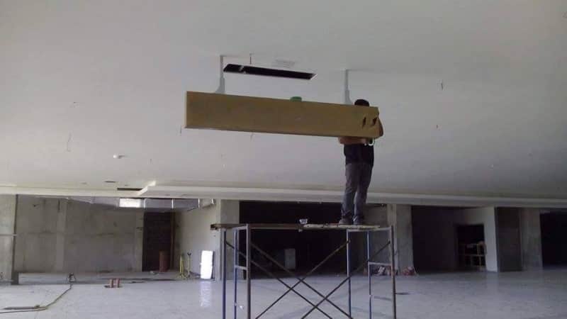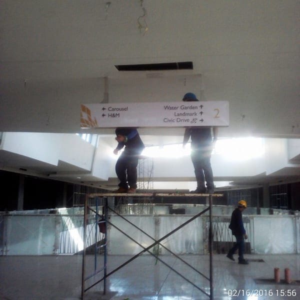Workers install indoor wayfinding ceiling signage in unfinished building, Metro Manila, by sign maker Philippines, M&G Global Ads.