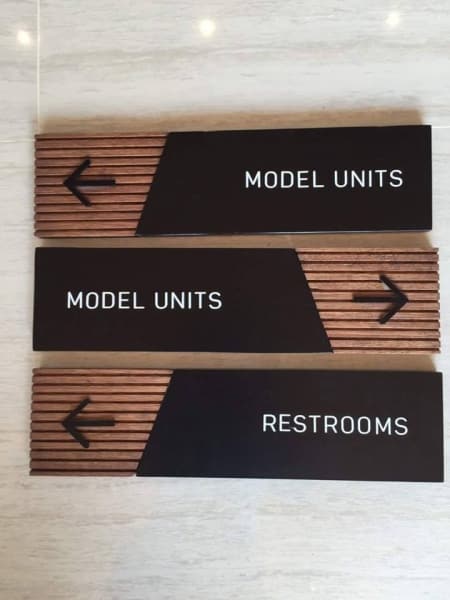 Three acrylic wayfinding signs, Model Units and Restrooms, Metro Manila, sign maker Philippines by M&G Global Ads.