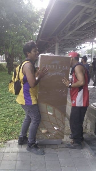 Two men carry a boxed acrylic Festival Skywalk signage on a sidewalk in Metro Manila by sign maker Philippines M&G Global Ads.