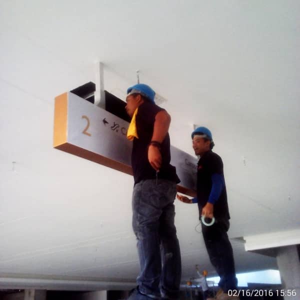 Two workers install an indoor wayfinding overhead sign with number 2, aluminum material, Metro Manila, by sign maker Philippines M&G Global Ads.
