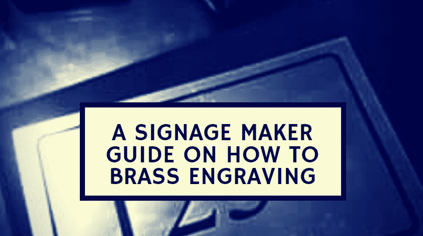 Brass engraved rectangular metal signage for business in Makati by M&G Global Ads. Blue-toned image with bold capital letters.