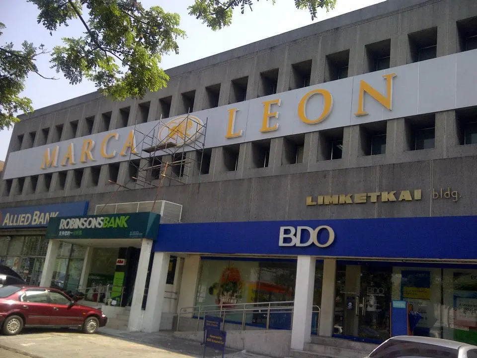 LED signage “MARCA LEON” for client on gray building in Makati, above Allied Bank, Robinsons Bank, BDO. by M&G Global Ads.