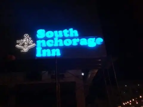 LED signage for South Anchorage Inn, blue letters and anchor graphic, seen at night in Quezon City by M&G Global Ads.
