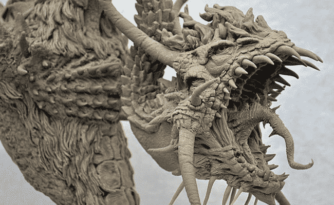 Close-up of clay dragon sculpture with sharp teeth and horns beside outdoor business signage in Makati by M&G Global Ads.