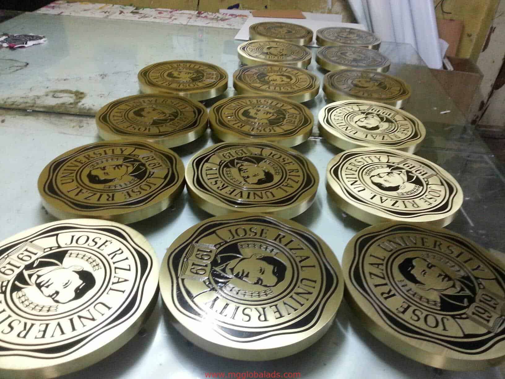 brass engrave signage for José Rizal University with gold and black emblems, perfect for Quezon City, by M&G Global Ads.