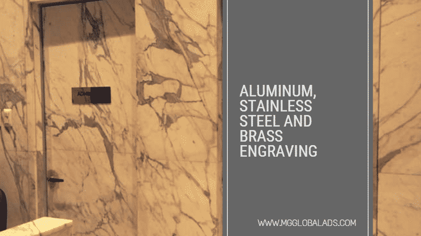 Metallic signage door sign in a marble interior, Ortigas. Aluminum, stainless steel, brass engraving by M&G Global Ads.