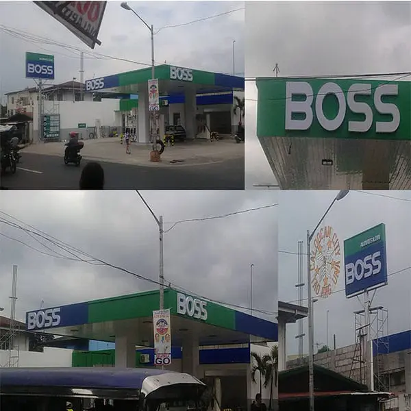 BOSS building signage at a green and blue gas station in Mandaluyong, canopy and exterior views, by M&G Global Ads.