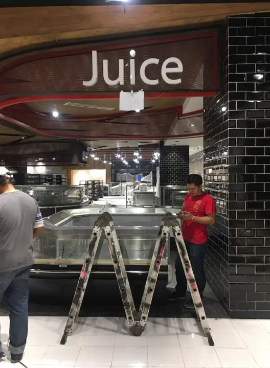 LED store signage for Juice client in Makati, with two men and a ladder inside a shop under renovation by M&G Global Ads.