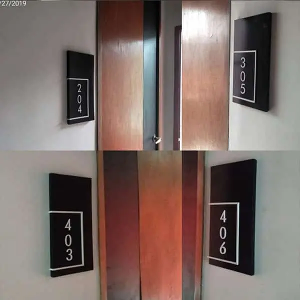 Black acrylic hotel room signage for doors 204, 305, 403, and 406 in Makati by M&G Global Ads.