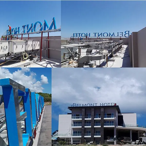 BELMONT HOTEL rooftop acrylic signage installation in Makati shown in four images, completed project by M&G Global Ads.
