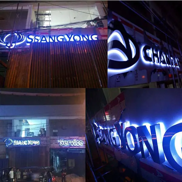 SSANGYONG metallic signage and LED Service signs at night on building exterior in Quezon City by M&G Global Ads.