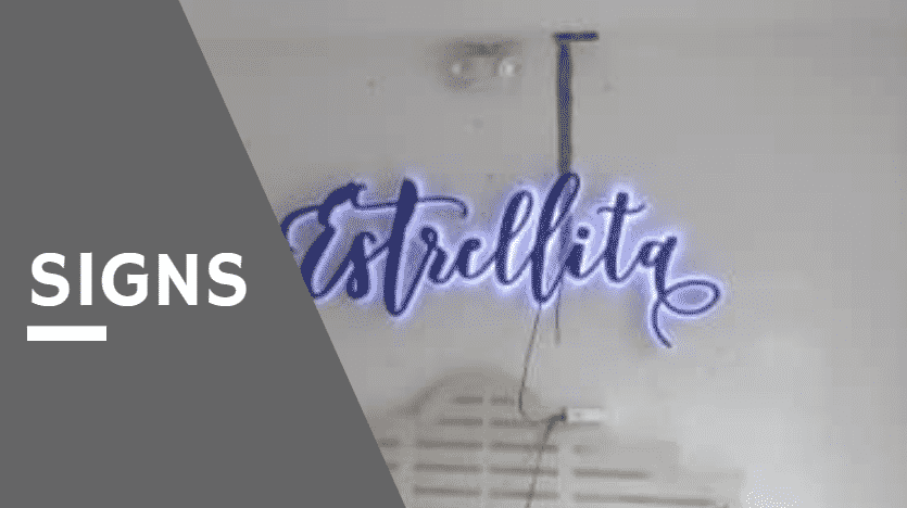 Neon LED signage for Estrellita in cursive, blue glow, gray triangle with SIGNS text. Makati installation by M&G Global Ads.