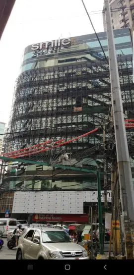 Building signage installation for SMILE, metallic channel letters on glass facade, Makati. Construction barriers visible. by M&G Global Ads.