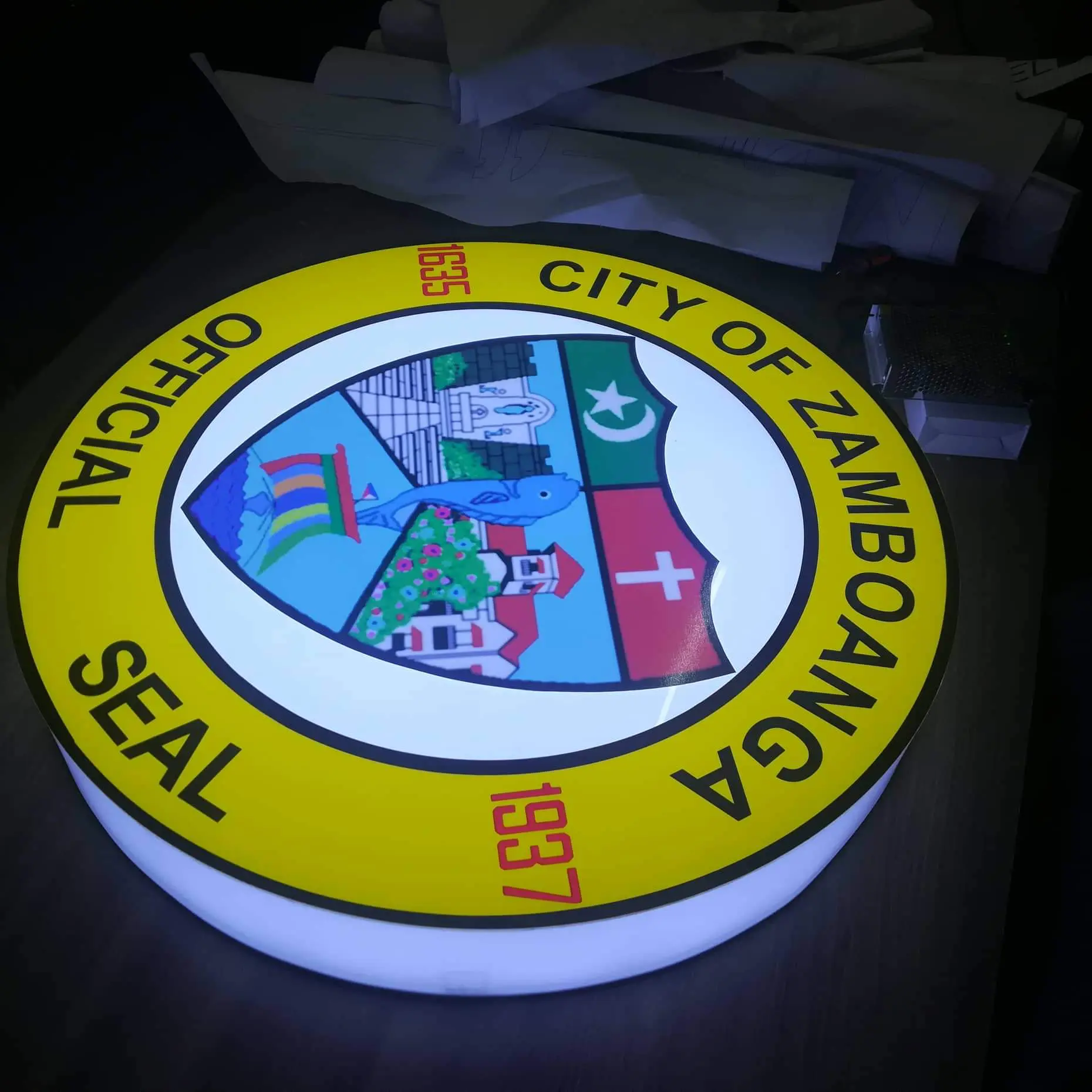 Illuminated metallic round signage for City of Zamboanga seal, Quezon City installation by M&G Global Ads.
