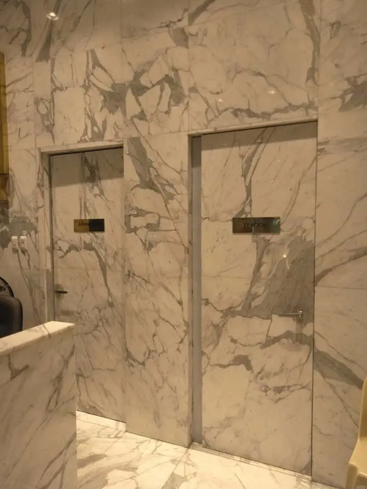 Sleek metallic acrylic restroom door signage on marble-wrapped wall in Makati, blending seamlessly with décor by M&G Global Ads.
