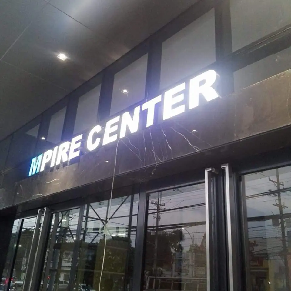 Acrylic outdoor signage for MPIRE CENTER at Quezon City, with text overlay, by M&G Global Ads.
