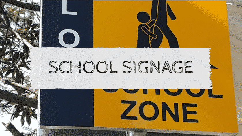 School zone signage for schools in Quezon City, yellow and blue with adult and child illustration, by M&G Global Ads.