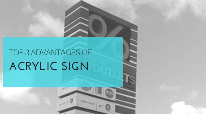 Acrylic outdoor signage for The Outlets with brand logos, blue info box in Ortigas by M&G Global Ads.