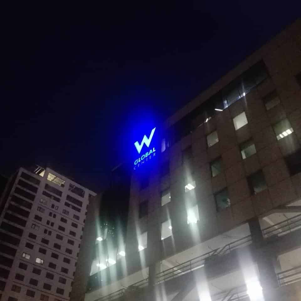 Acrylic signage with blue W logo and GLOBAL CENTER for office building in Ortigas at night, illuminated windows, by M&G Global Ads.