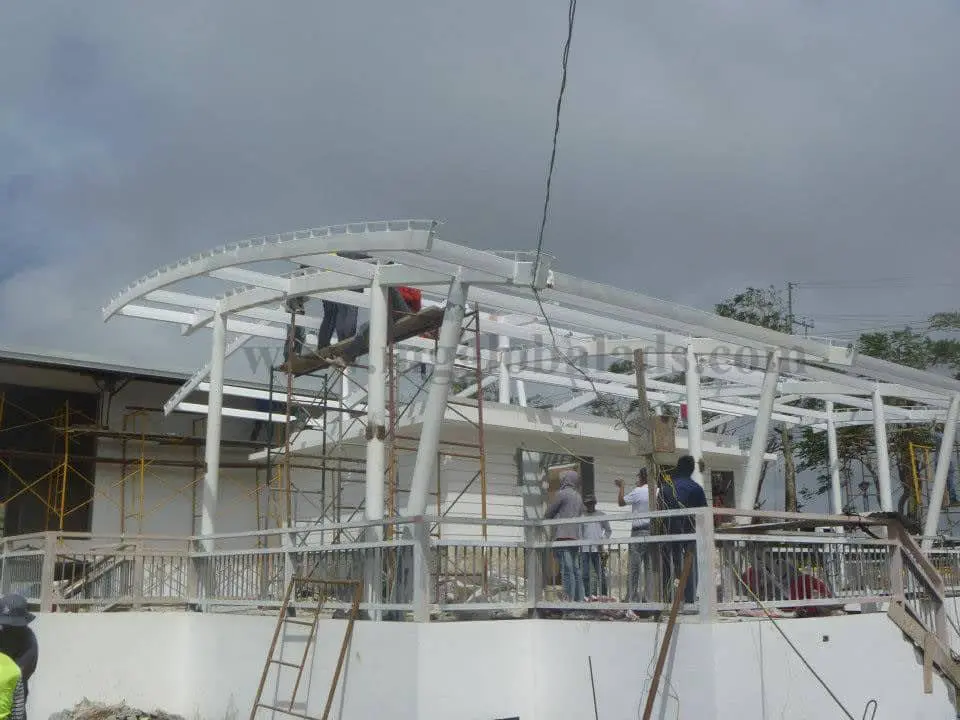 Steel canopy outdoor signage under construction with scaffolding in Makati, Manila by M&G Global Ads.