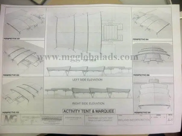 Outdoor tarpaulin and acrylic signage for event tent, with architectural drawings and finished structure in Makati by M&G Global Ads.