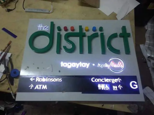 Wayfinding signage for the District by M&G Global Ads in Makati, with green letters, evacuation plan, icons, and directions.
