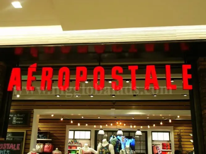 Aéropostale red channel letter signage at store entrance in Makati with mannequins and trendy clothing by M&G Global Ads.