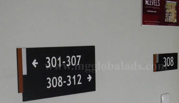 Acrylic room number signage in Quezon City shows rooms 301–307, 308–312 with arrows and room 308 sign by M&G Global Ads.