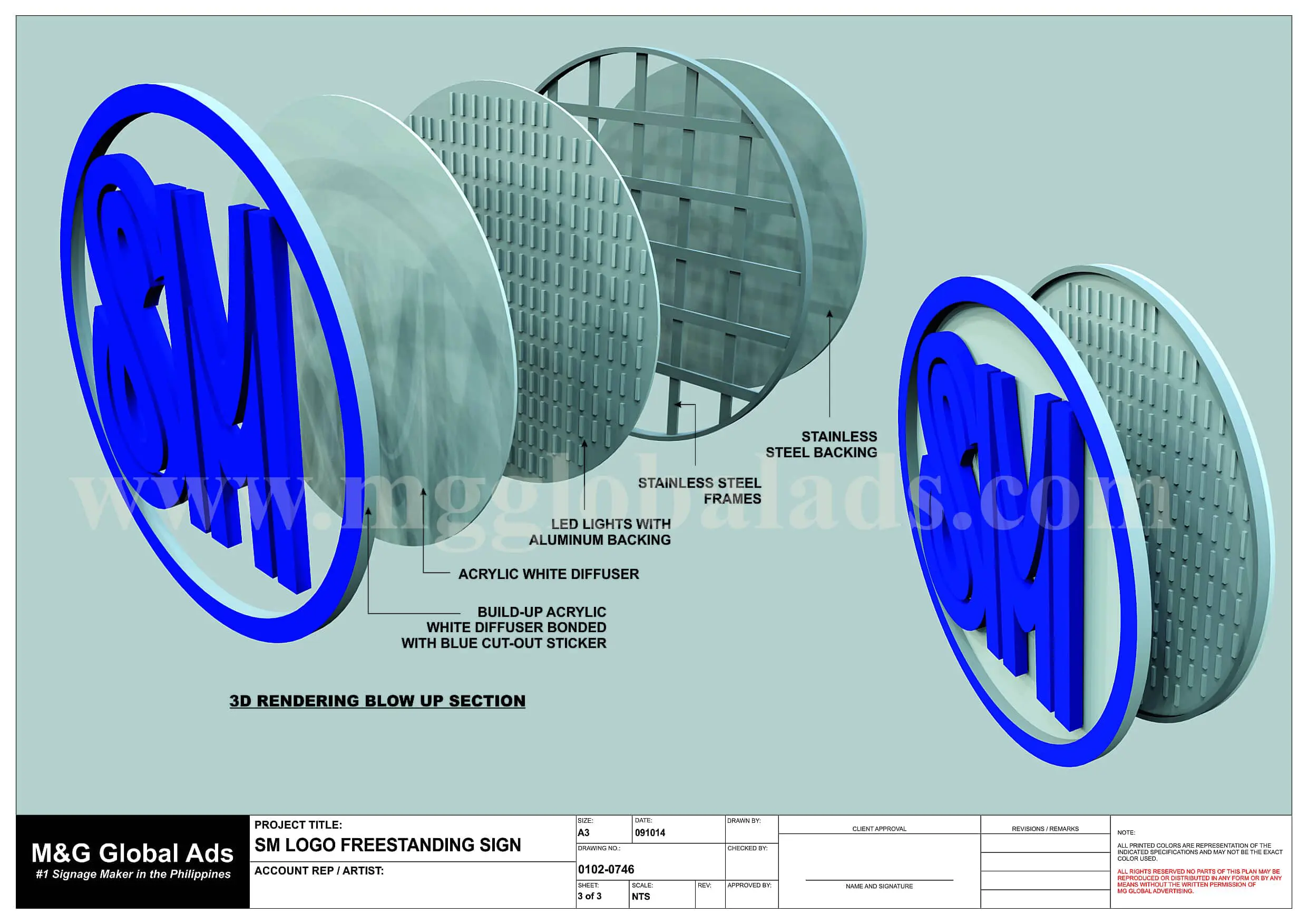 Freestanding SM logo outdoor signage technical drawing in Makati with detailed framing, lighting, specs by M&G Global Ads.