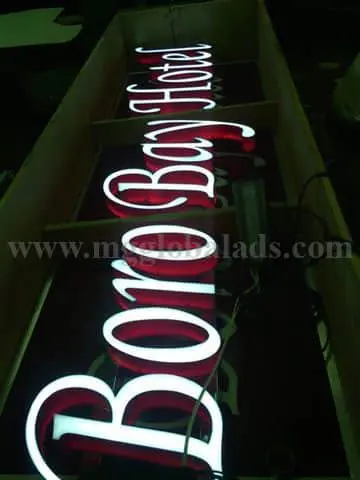LED signage for Boro Bay Hotel in white and red, inside wooden crate, Quezon City installation by M&G Global Ads.