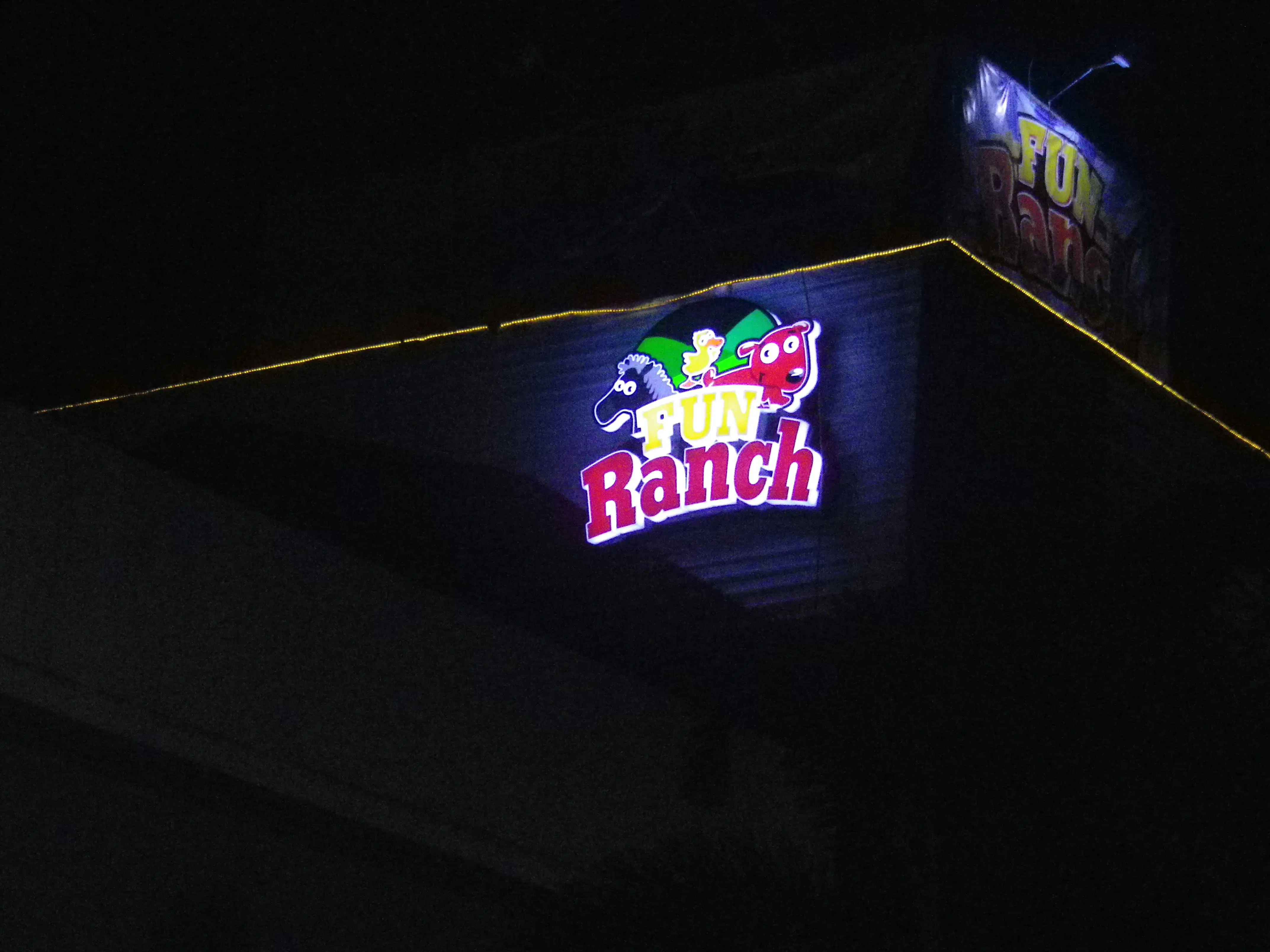 Fun Ranch outdoor building signage in Ortigas with cartoon animal faces and yellow lights at night by M&G Global Ads.