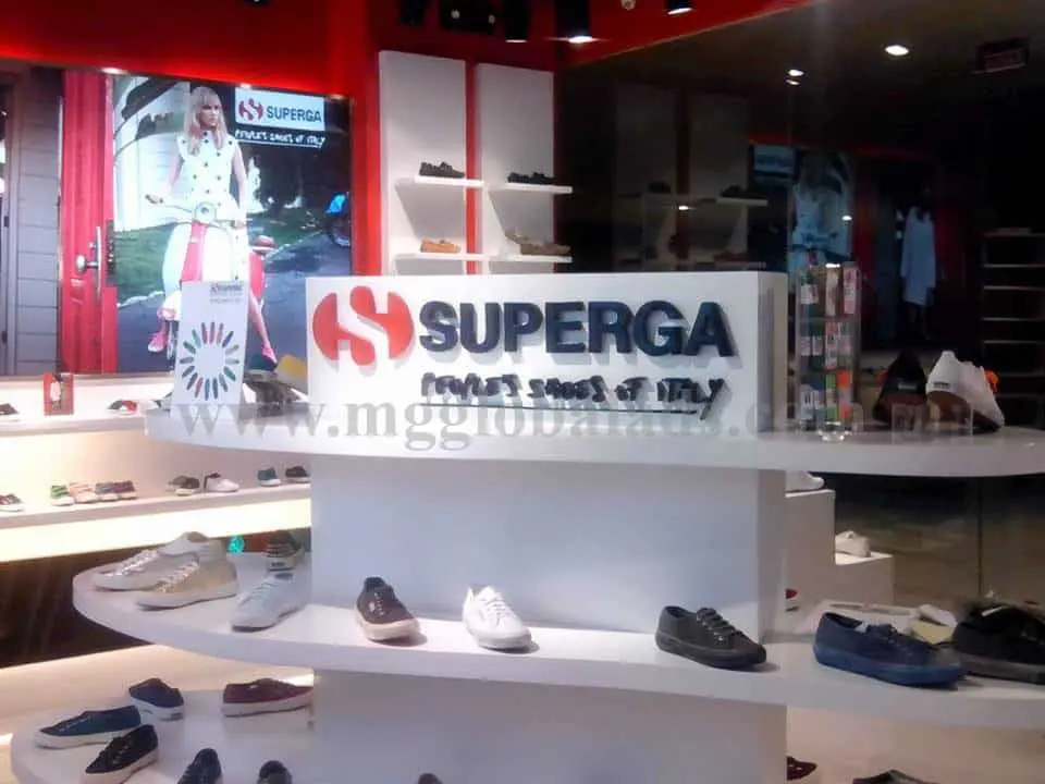 Acrylic Superga signage for shoe store client in Makati with sneakers display and branded wall, by M&G Global Ads.