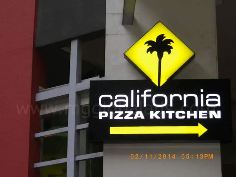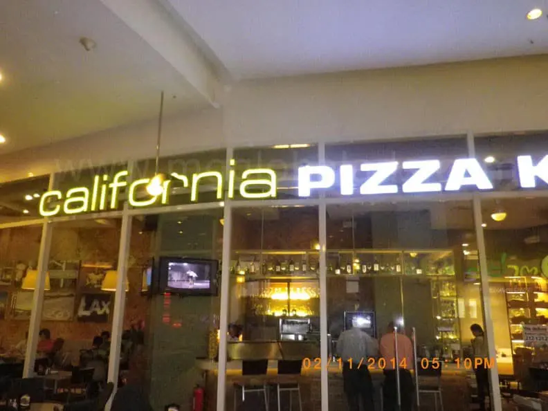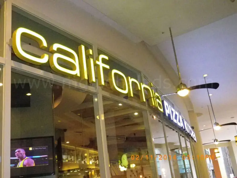 California Pizza Kitchen yellow LED signage above restaurant entrance in Quezon City mall by M&G Global Ads. Ceiling fans and TV inside.