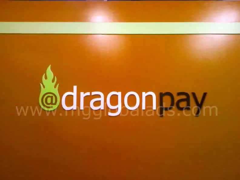 Dragonpay acrylic signage on orange wall in Makati, featuring logo with green flame @ icon, by M&G Global Ads.