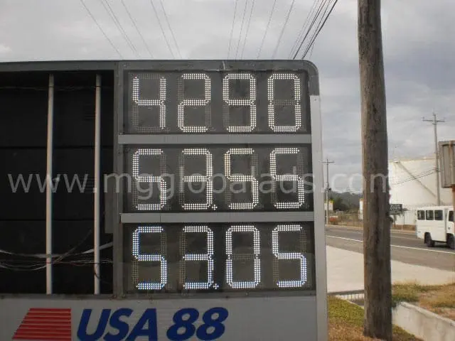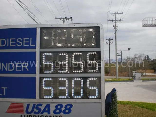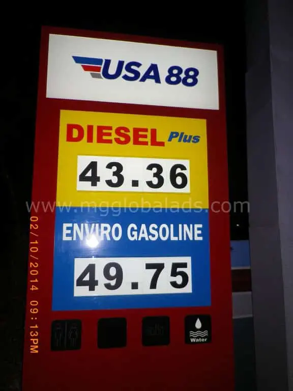 LED gas station price signage for USA 88 in Makati, showing fuel prices and time stamp at night by M&G Global Ads.