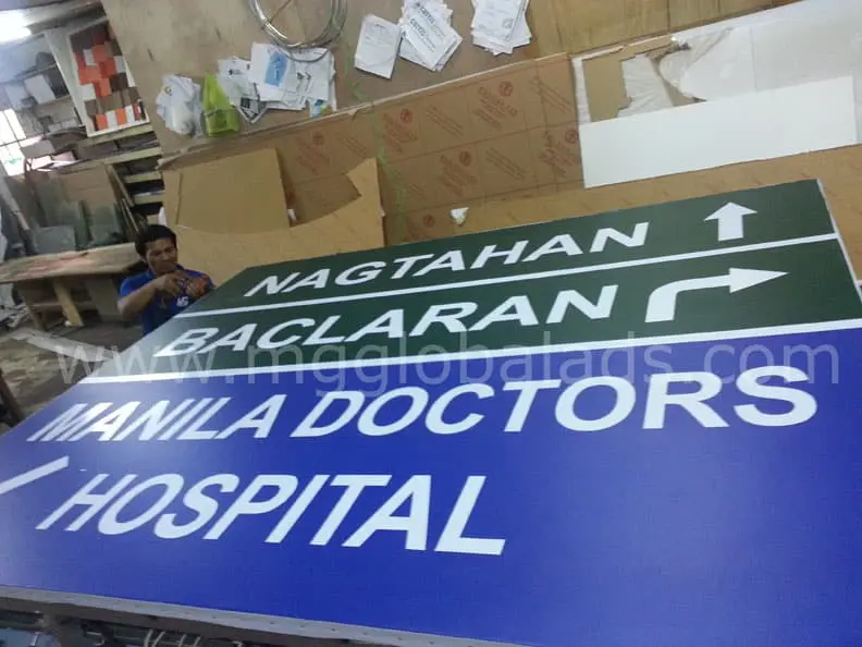 Illuminated acrylic road sign for Manila Doctors Hospital directions in Makati, purple and green signage by M&G Global Ads.