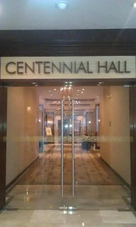 Centennial Hall glass double doors with LED building signage above in Mandaluyong, chandelier-lit hallway by M&G Global Ads.