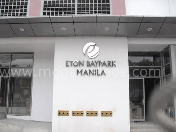 Outdoor building signage for Eton Baypark Manila in Makati with silver logo and sign, four square openings by M&G Global Ads.
