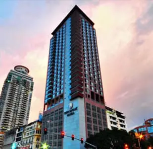 Modern hotel with illuminated building signage in Makati, shot at sunset with cityscape and traffic lights by M&G Global Ads.