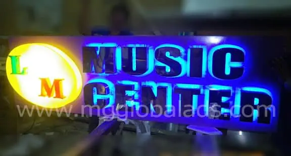 Illuminated outdoor signage for L M MUSIC CENTER in blue and yellow, Quezon City location, by M&G Global Ads.