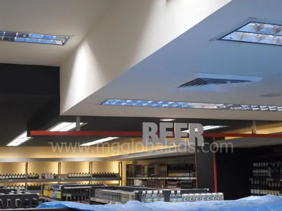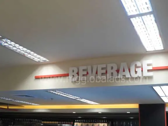Overhead indoor store signage, large BEVERAGE letters, Quezon City location, fluorescent lights, by M&G Global Ads.