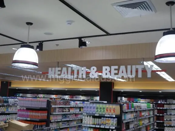 Health & Beauty indoor signage in supermarket aisle, bright lights, shelves stocked, Quezon City location by M&G Global Ads.