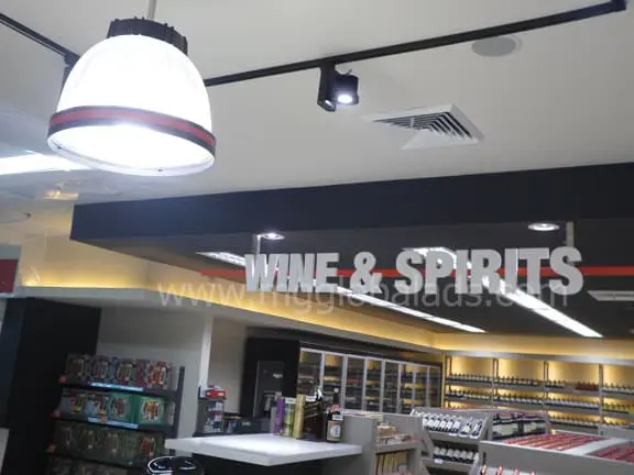LED signage reading WINE & SPIRITS in a brightly lit store section in Quezon City, shelves stocked, by M&G Global Ads.