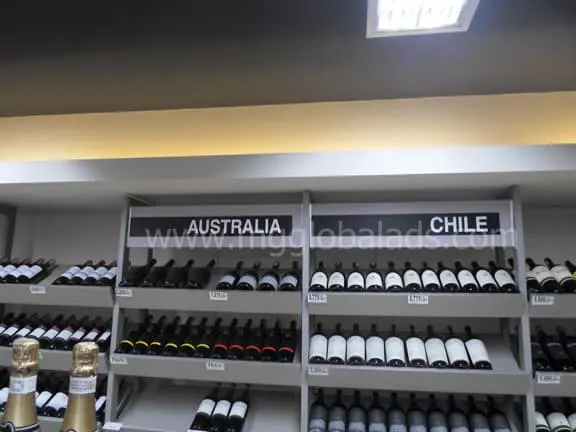 Acrylic signage for AUSTRALIA and CHILE wine shelves at a Makati store, champagne bottles shown. By M&G Global Ads.